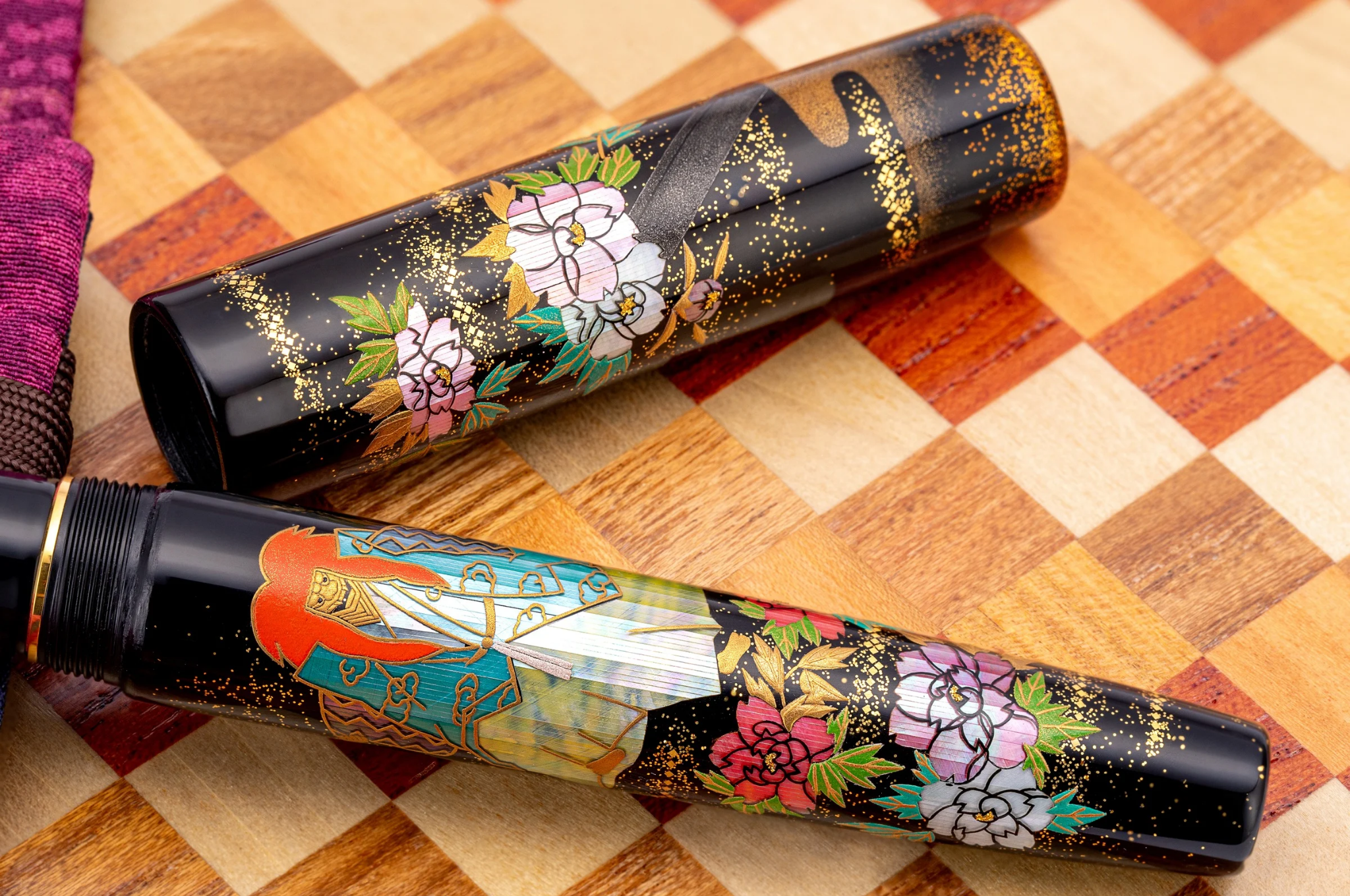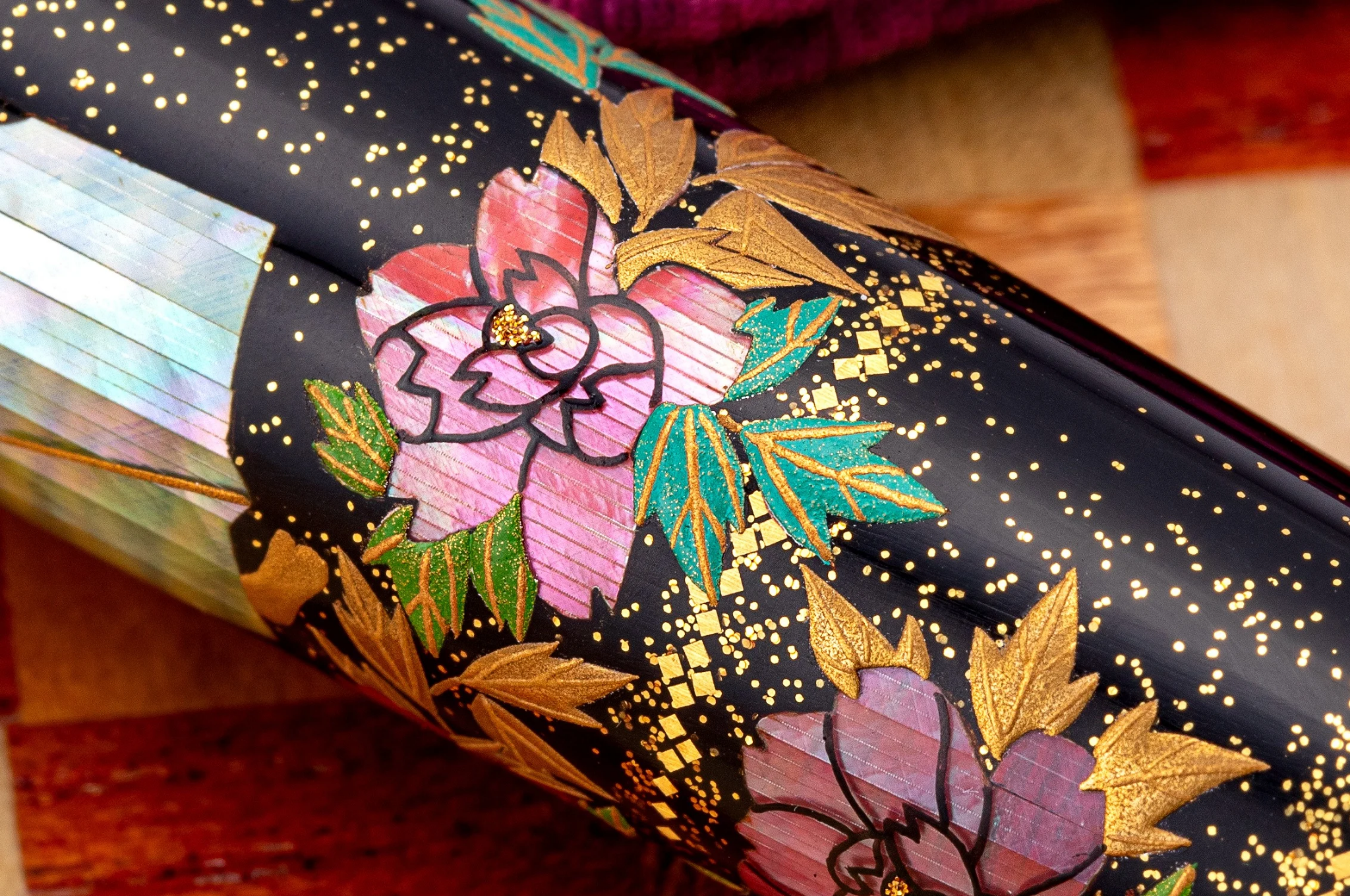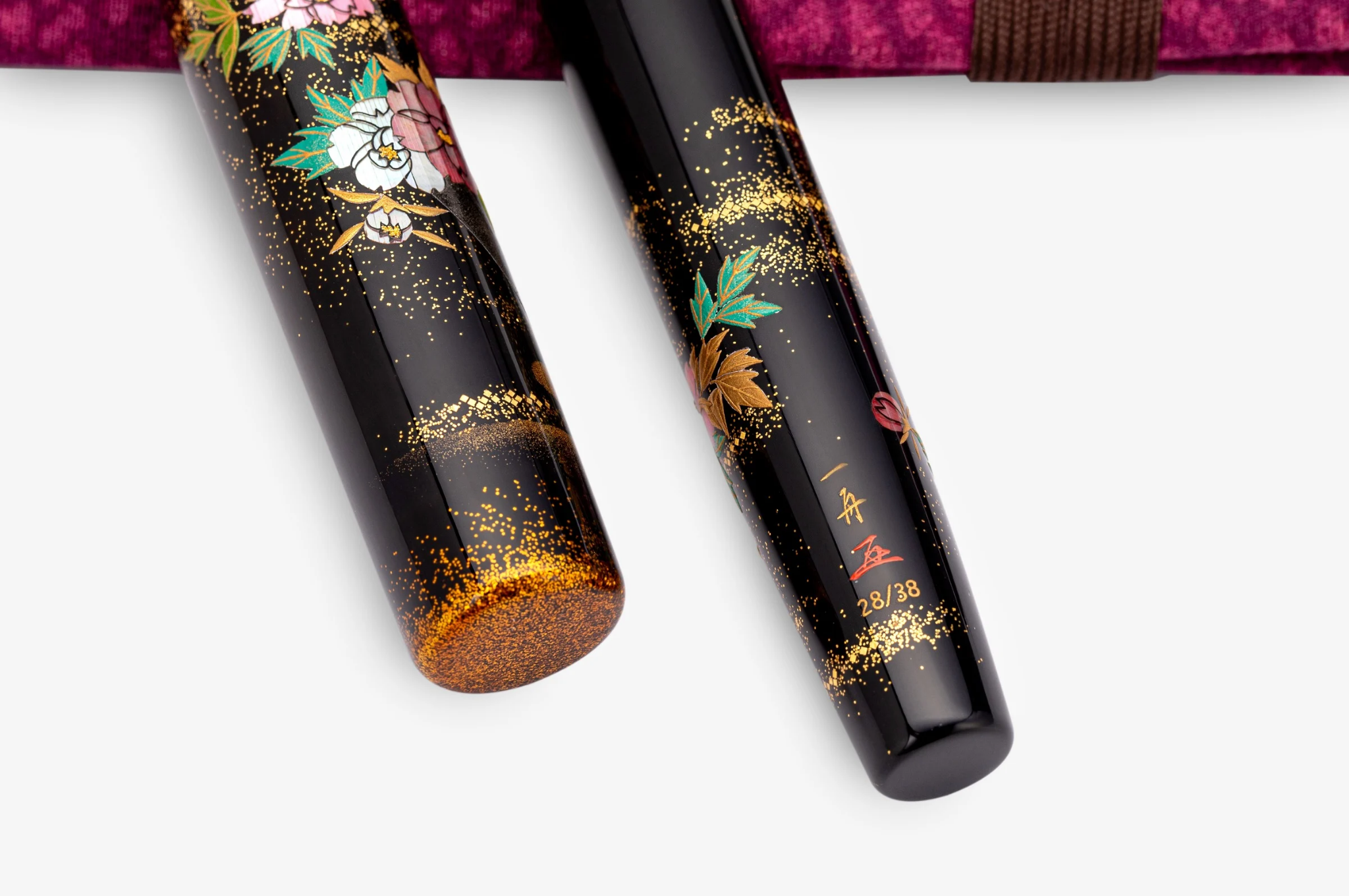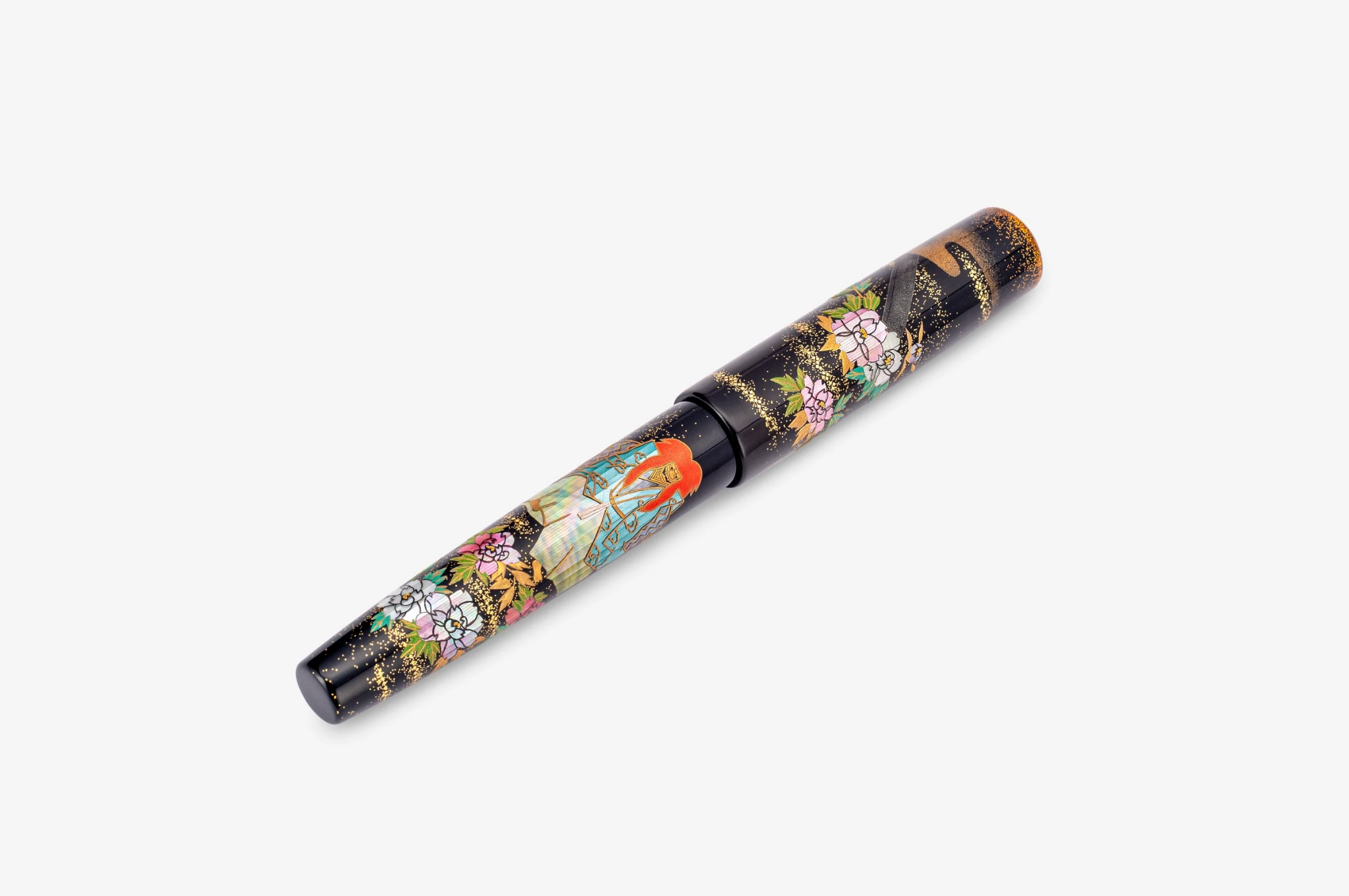 Each piece is decorated and meticulously brought to life with urushi lacquerware techniques, combining the traditional urushi techniques of Maki-E and Raden. The deep black ebonite barrel is enhanced with mother-of-pearl and abalone shell raden, creating a shimmering with the gold sprinkles contrasting. The result is a fountain pen that feels both artistic and timeless - a delicate piece of functional art unfolding in front of its owner. A treat reserved for the very few - King of Pens Shakkyo is a limited edition of only 38 pieces world wide.