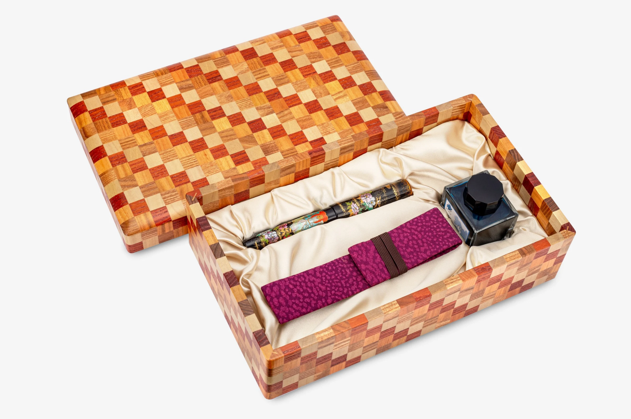 The presentation is completed by an exquisite gift box crafted using Hakone marquetry, a traditional woodworking technique developed during the Edo period. Created by meticulously assembling different types of natural wood into intricate geometric patterns, the box itself is a work of art, a tribute to Japanese craftsmanship and a timeless expression of heritage.