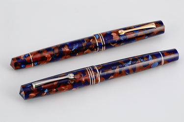 This fountain pen is the latest release into the Momento Zero collection. It is worked by hand from a solid resin bar. This unique color pattern is made from a combination of 2 colors: dark blue with light translucent brown. The colors are random mixed into the resin bar, making every pen's color unique. The color is accentuated by rhodium or gold-plated trims. The tapered shape is inspired by the classic Italian design.