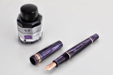 Complementing the purple Thunder celluloid, all the trim elements are Rose Gold plated. Limited edition exclusive only at Pen Venture and numbering only 10 pieces, every pen is offered in a box along with a bottle of Leonardo Purple ink. (*pen sleeve not included, available here)