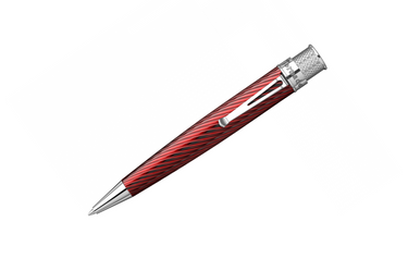 The Retro 51 Tornado Big Shot Hawthorne rollerball makes a striking impression with its distinctive weight and deep red body. Engraved with a continuous spiral that captures and reflects light, this rollerball draws you into a state of focus and tranquility with every use. Polished chrome accents enhance its sophisticated and timeless appearance, making it a standout addition to any collection.