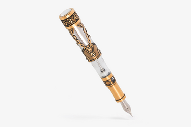 Crafted with meticulous attention to detail, the fountain pen features an aged Vermeil and demo resin body, allowing a clear view of the ink level and the unique filling system inspired by Galileo's technical brilliance. This system, reminiscent of our Power Filler Double Reservoir, omits an external piston in the blind cap, ensuring safer, cleaner, and more consistent refills, seamlessly integrated with the pen's barrel design.